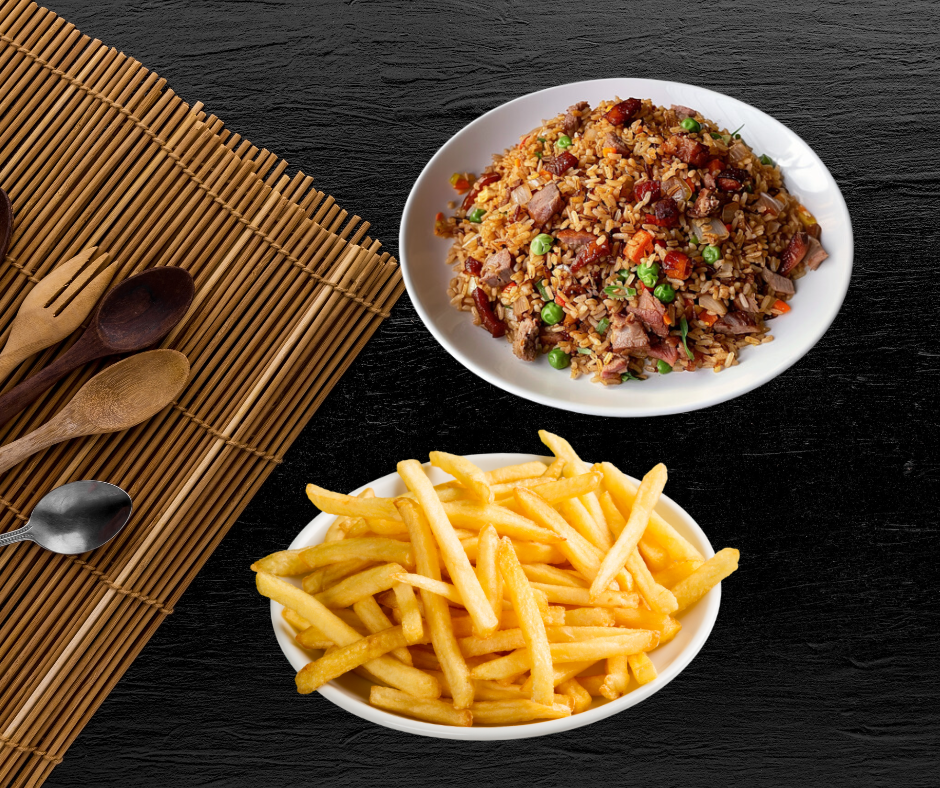 Entero de Arroz Cantonés (500 g Apróx.) + Una porción de Papas Fritas Grandes (Combo para 1 persona)