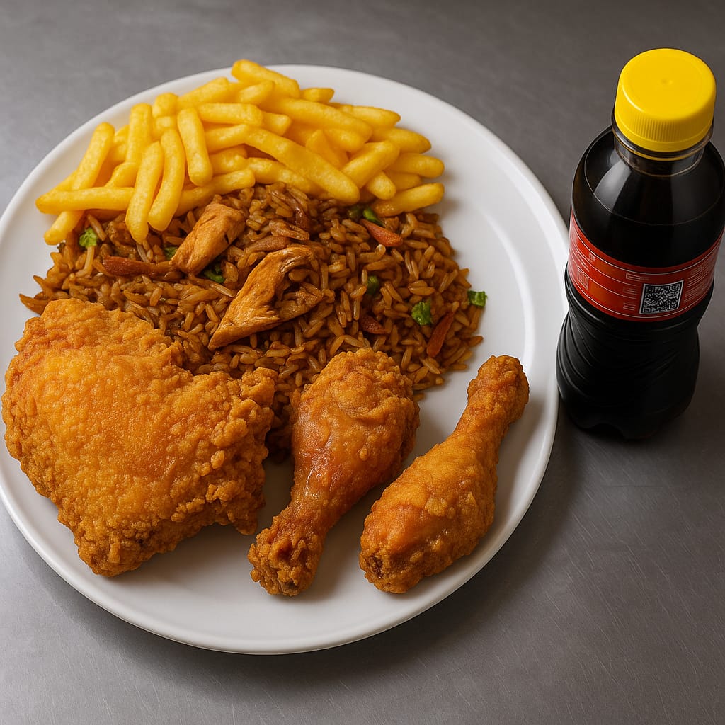 Combo personal: ½ arroz cantonés (aprox. 250 g), 1 pieza de pollo frito (según disponibilidad), porción pequeña de papas fritas y refresco de 250 ml. Si hay disponibilidad, se envía un pan gratis.