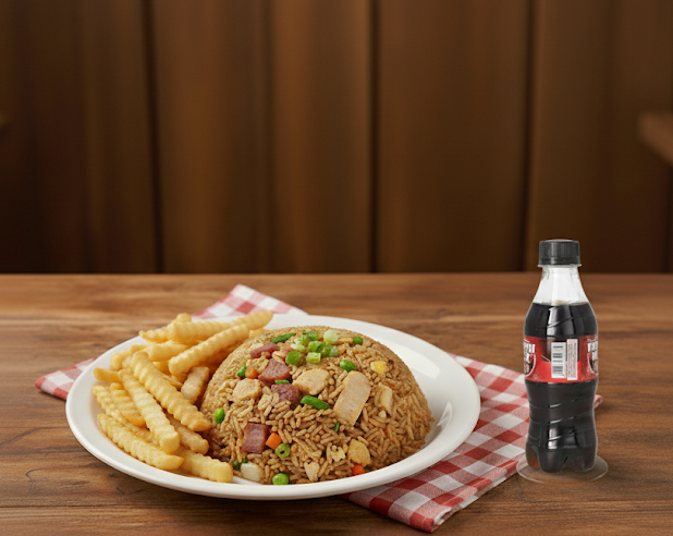Porción personal: delicioso arroz cantonés acompañado de papas fritas y refresco de 250 ml.