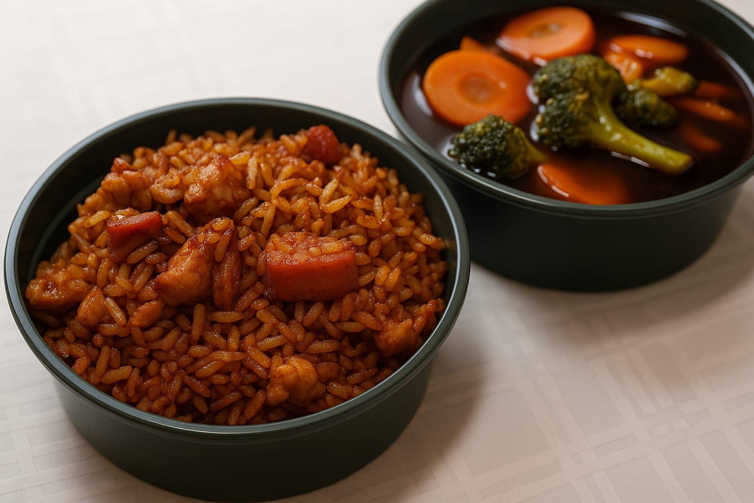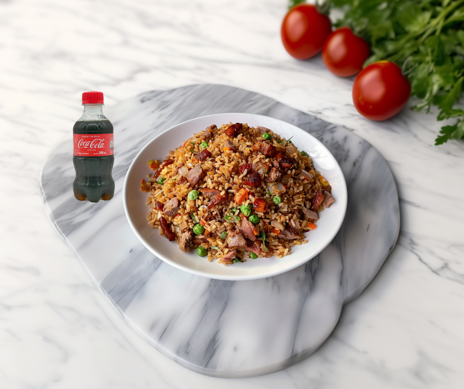 Delicioso arroz cantonés entero (aprox. 500 g) con cerdo, jamón, pollo y cebollín, ahora acompañado de un refresco de 250 ml. ¡La combinación perfecta para disfrutar!