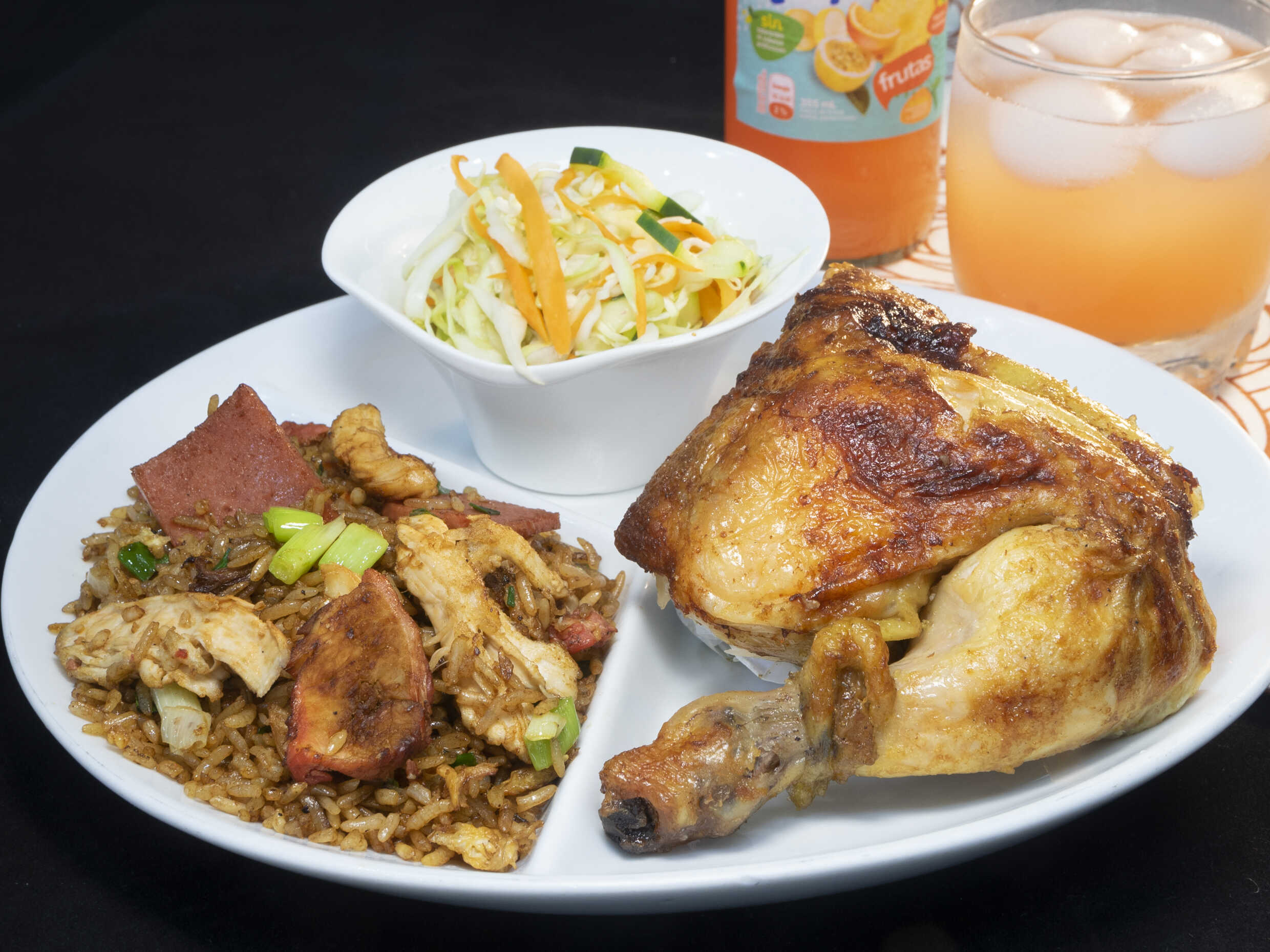 Arrocito frito con trozos de nuestro especial pollo asado, huevo y cebollin