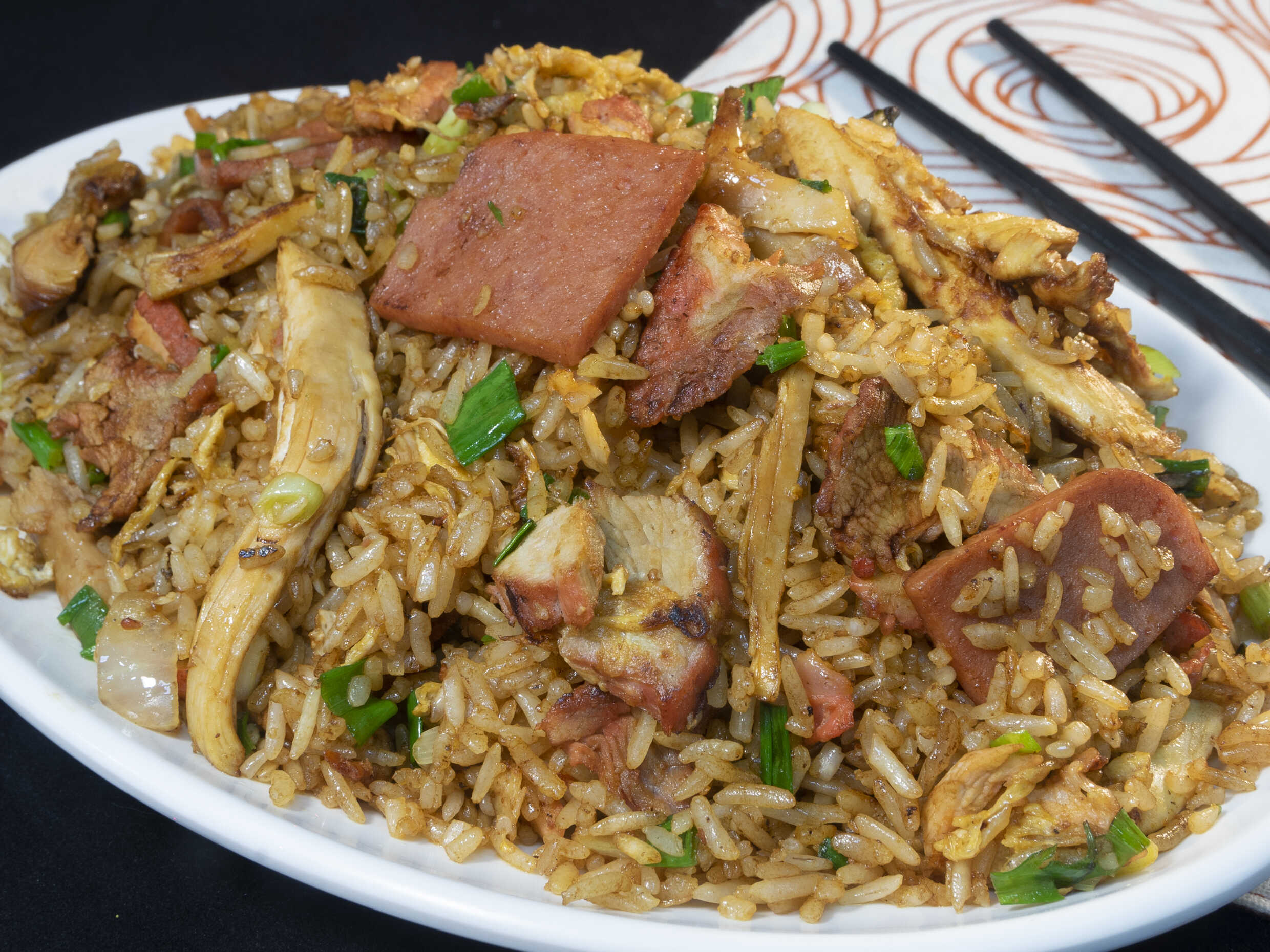 Arroz frito con pollo, jamon, lechon y huevo con cebollin, incluye salsa (Porcion personal)