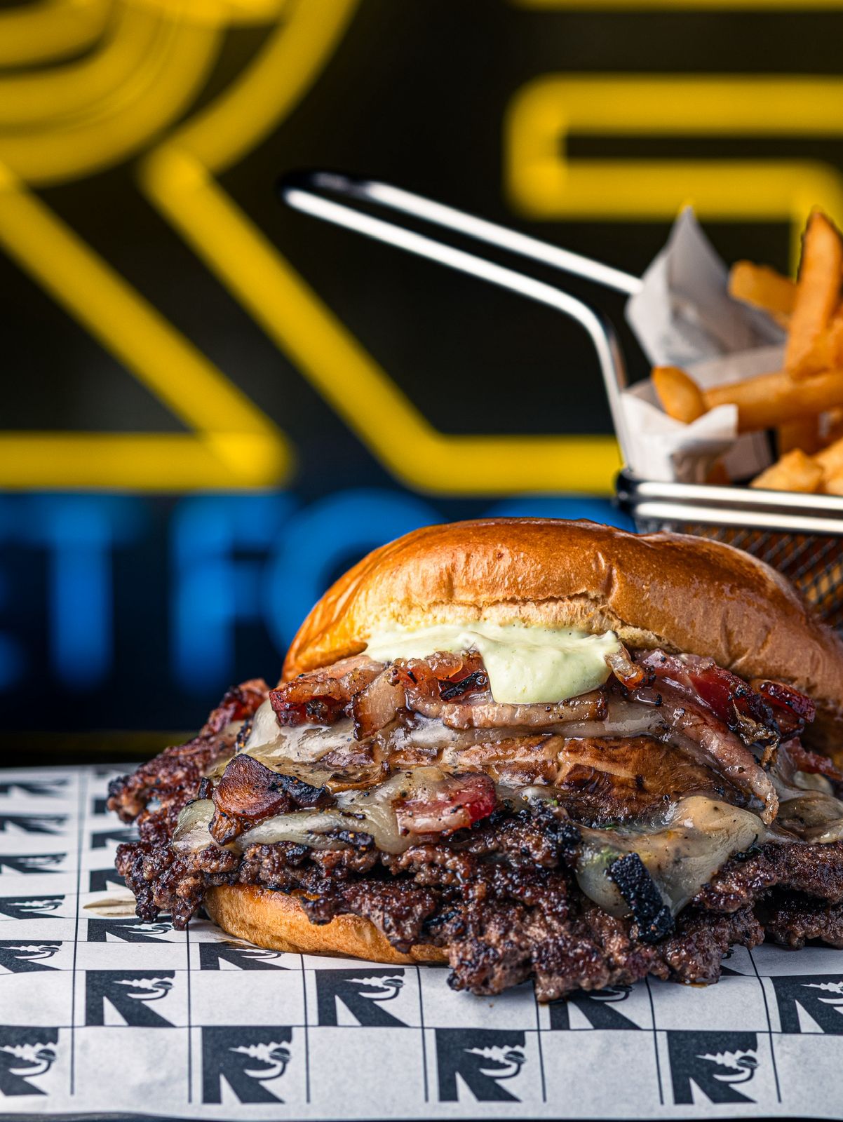 Una obra maestra del sabor: doble smash jugoso de 100 g, fusión de quesos cheddar y blanco, crocante equilibrio entre pepinillos y bacon bites, y el toque estrella de nuestra exclusiva mayonesa trufada.