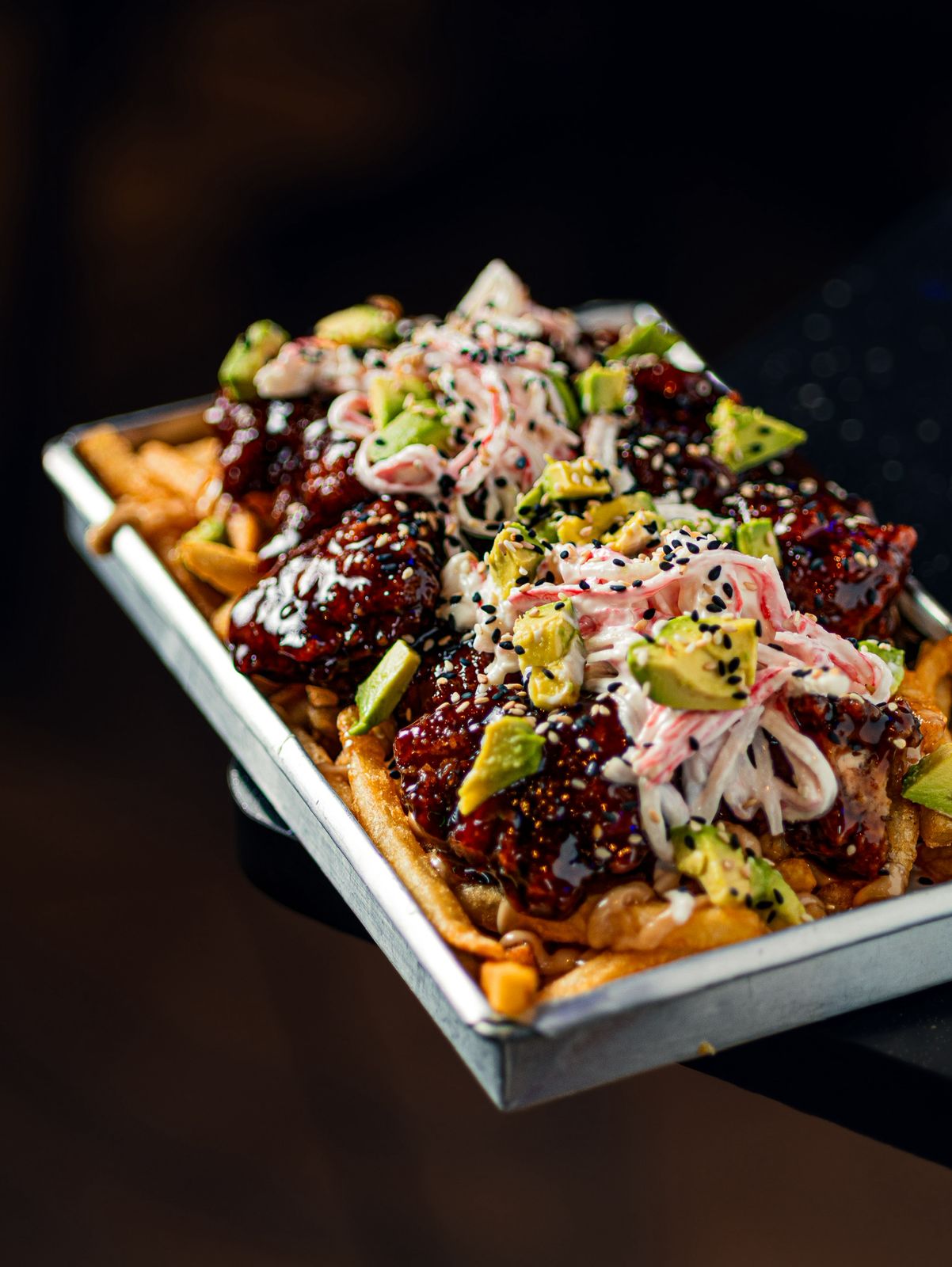 Crujientes papas doradas acompañadas de tiras de pollo empanizado en panko glasedas con teriyaki artesanal. Ensalada fresca de kanicama (cangrejo), aguacate, alioli black garlic, cebollin y un toque sesamo tostado coronan esta obra maestra.