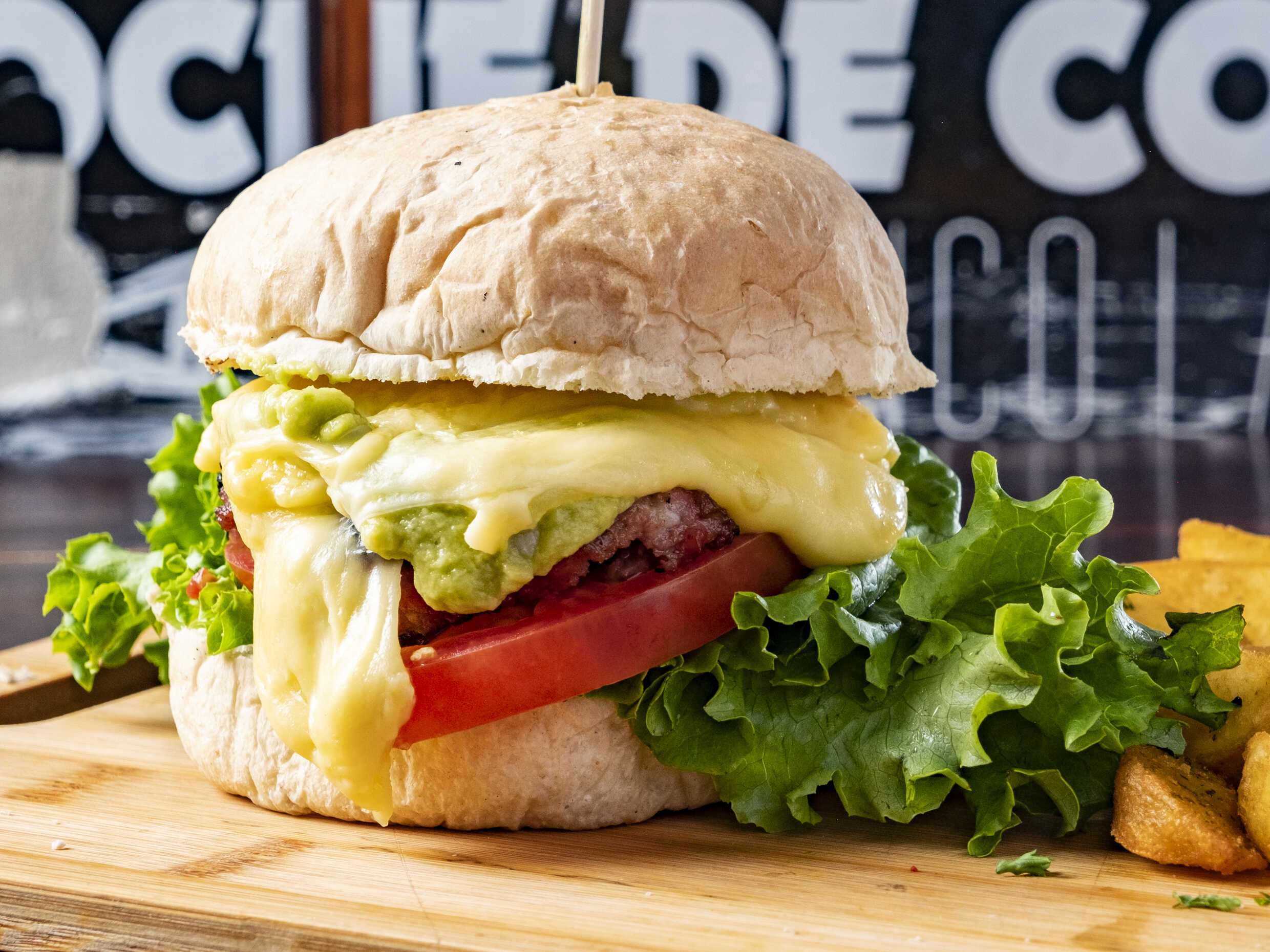 Jugosa torta de carne 100% angus, pan artesanal, queso mozarella, guacamole, salsa BBQ, lechuga, tomate y cebolla morada en encurtido.