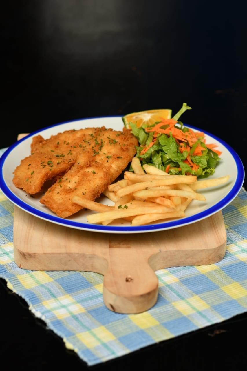 Fajitas de pescado empanizadas, acompañadas de papas fritas y salsa de la casa.