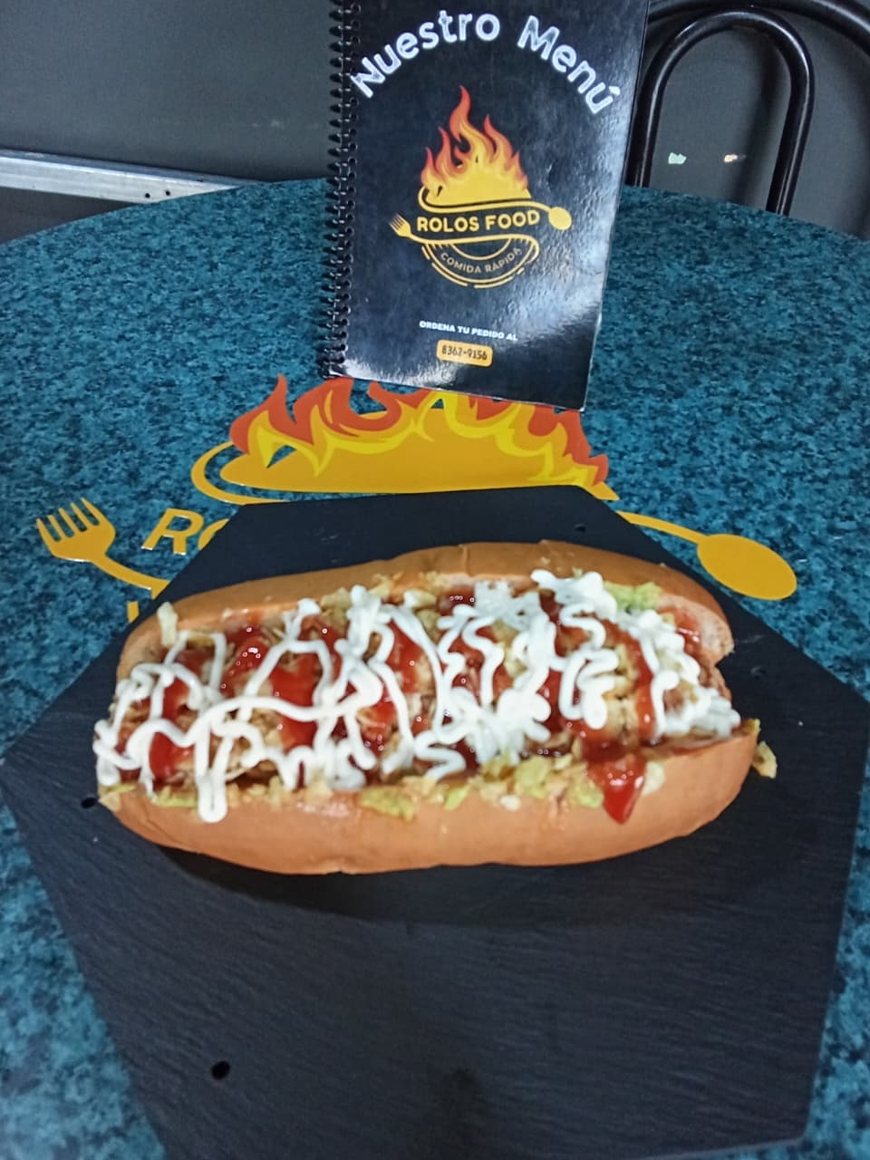 Delicioso Perro Mechado acompañado de guacamole, queso mozarella derretido, carne mechada, papas tostadas y salsas de la casa