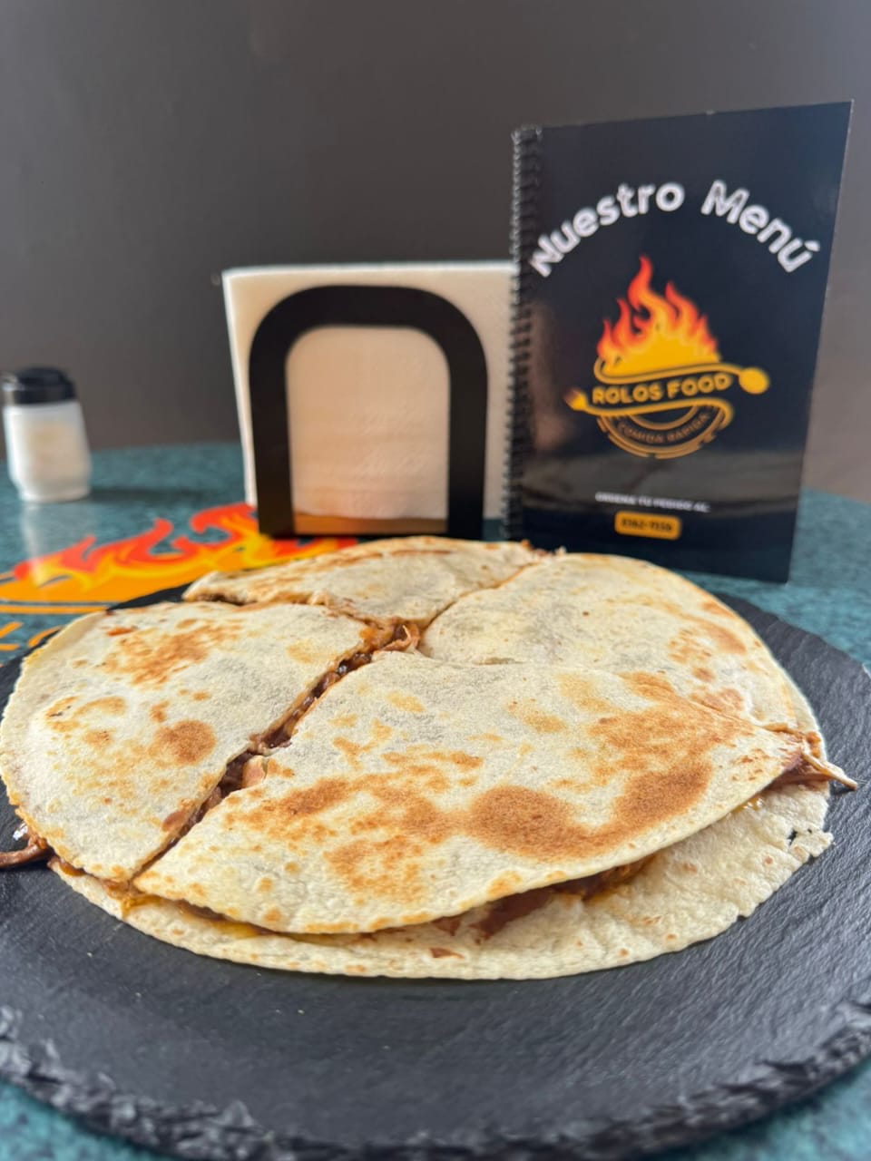 Deliciosa quesadilla, tortilla de harina a la plancha, carne mechada, queso y frijoles molidos.