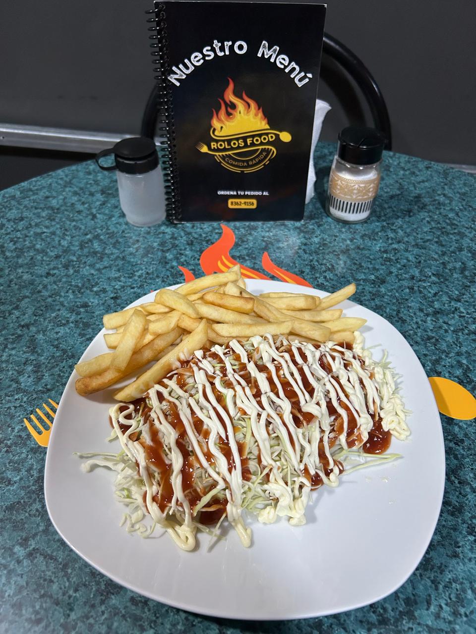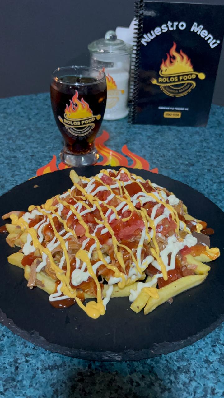 Deliciosas papas fritas con salchicha y salsa de la casa.