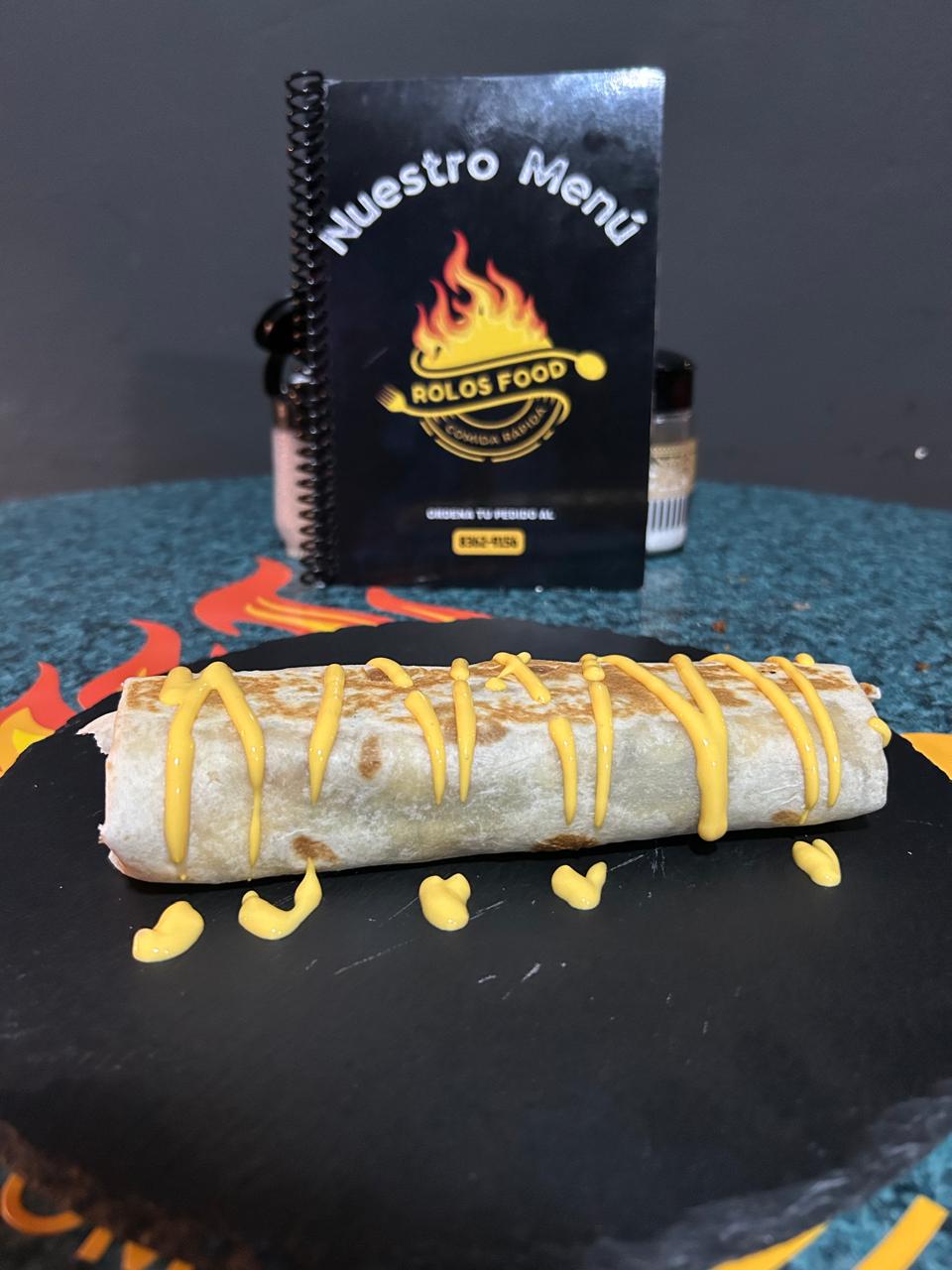 Delicioso burrito en tortilla de harina, frijoles, salsa de queso, salsas de la casa, lechuga, pico de gallo.