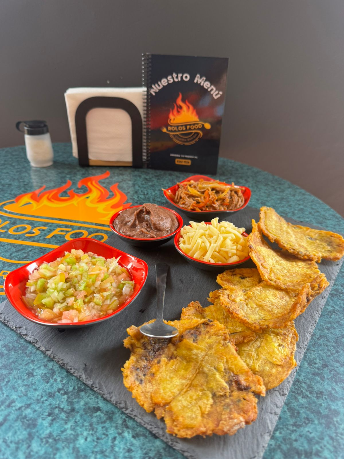 Deliciosos patacones arreglados, carne, frijoles, pico de gallo.