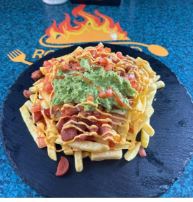 Delicioso Papanacho con papas fritas, frijol molido, carne mechada, pico de gallo y salsas de la casa con queso cheddar
