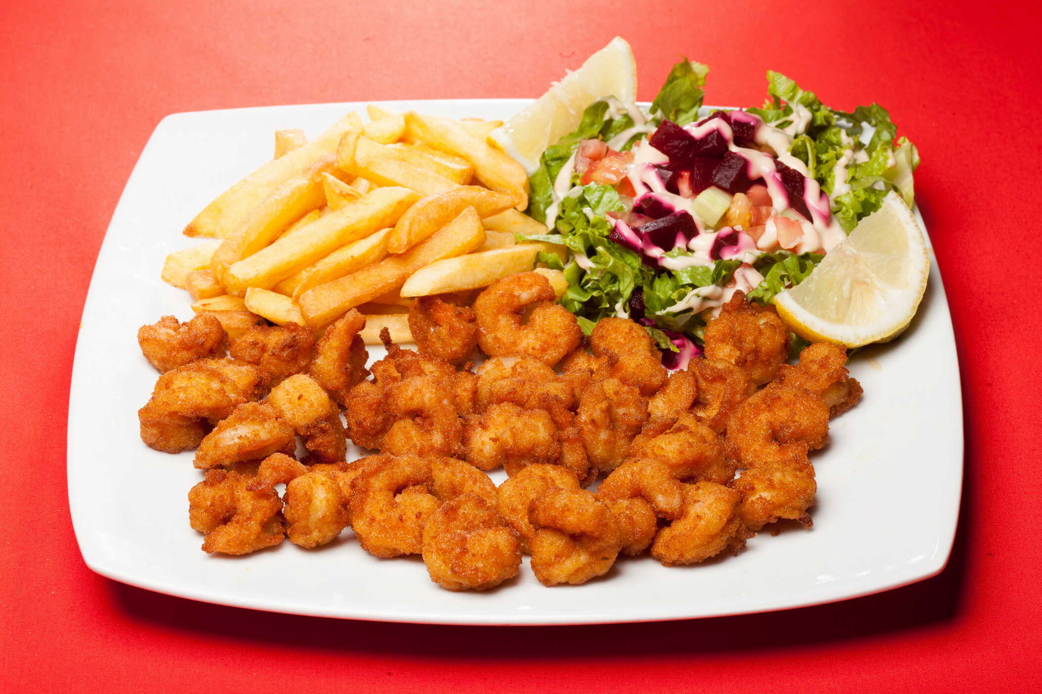 Camarones empanizados, papas fritas y ensalada verde.