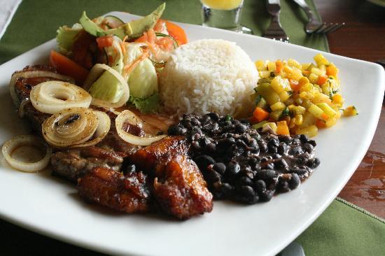 Arroz, frijoles, plátano maduro, ensalada y la proteína.