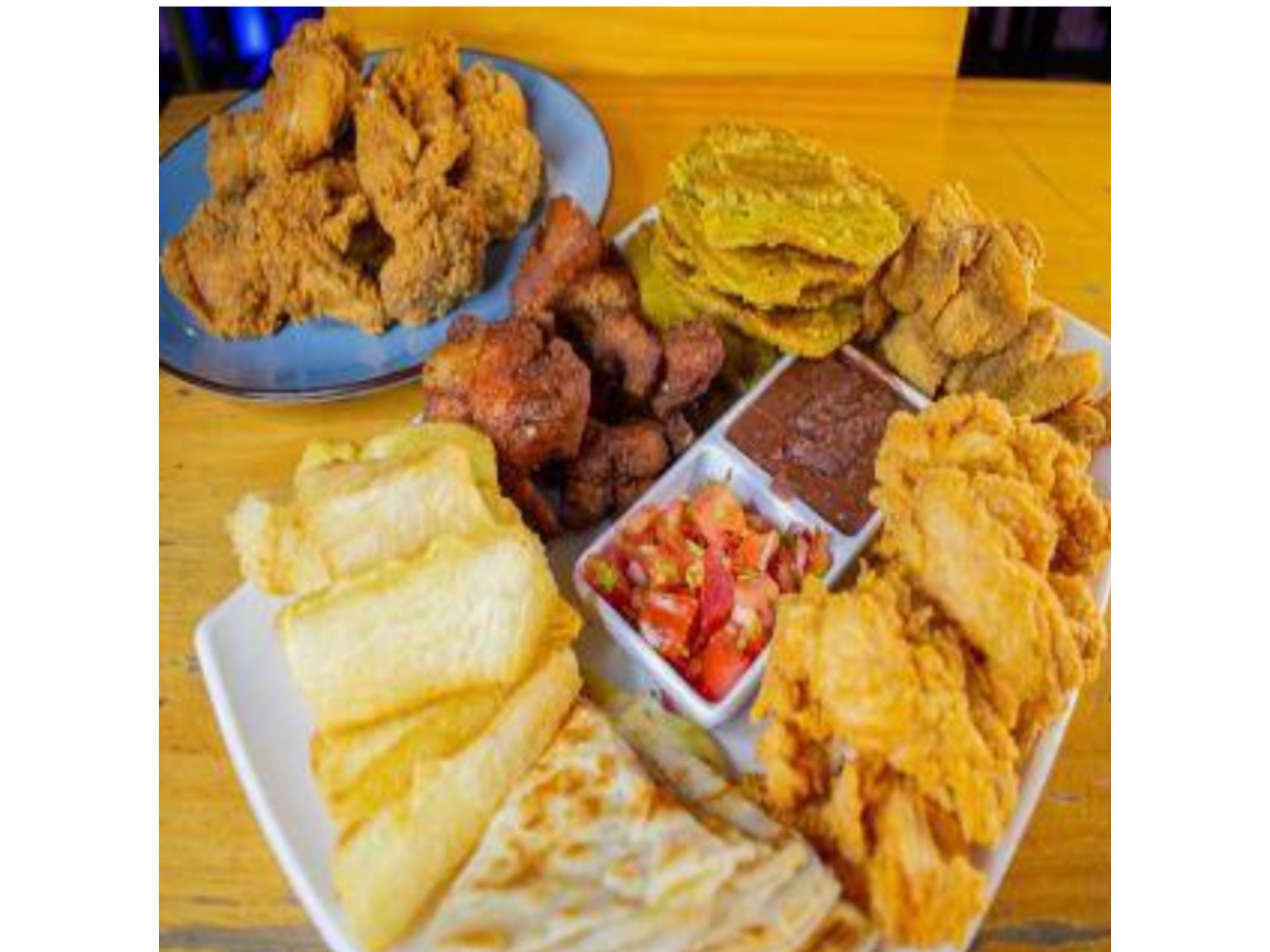Patacones, yuca, quesadillas, chicharrón, alitas, pechuguitas, dedos de pescado, pico de gallo y frijoles molidos.