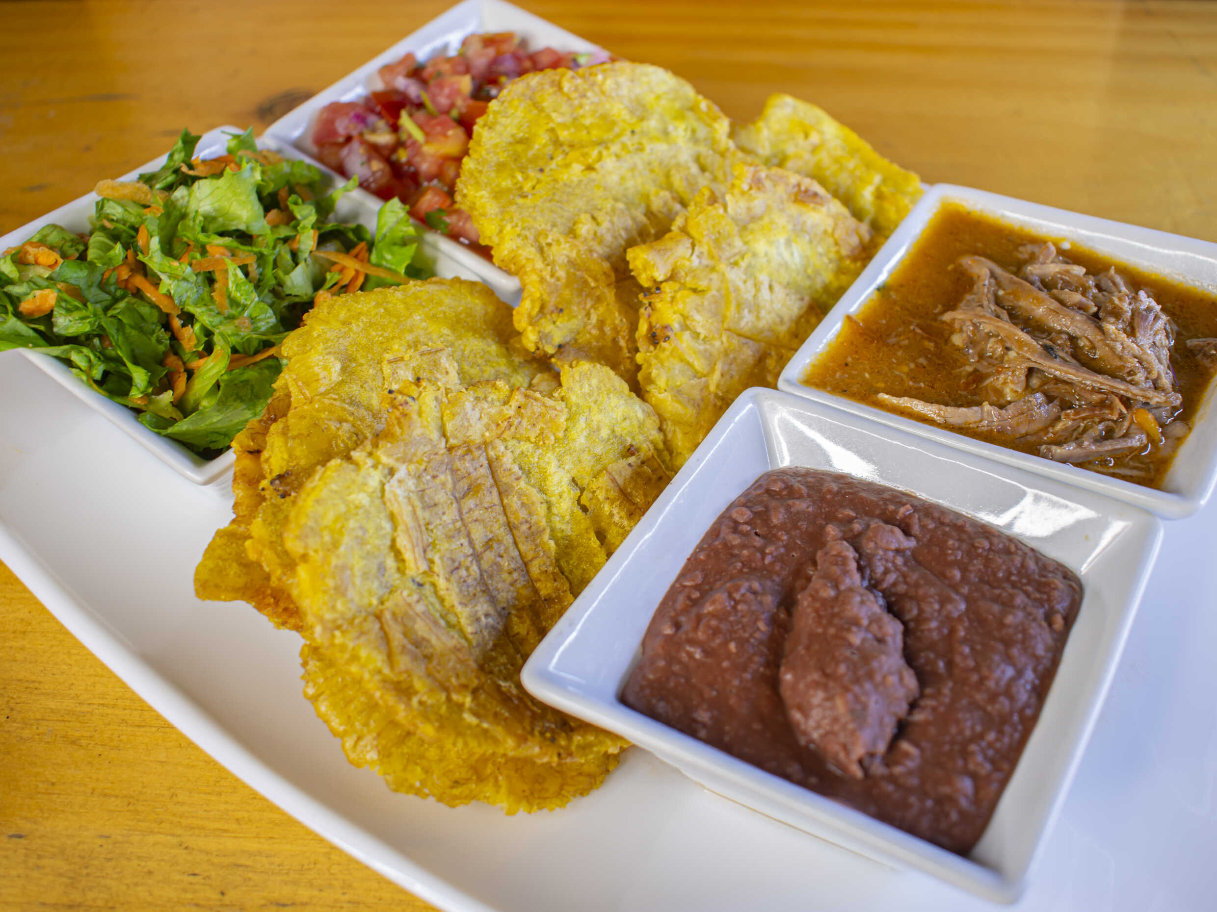 Orden de 6 patacones, frijoles molidos, carne mechada, ensalada verde y pico de gallo.