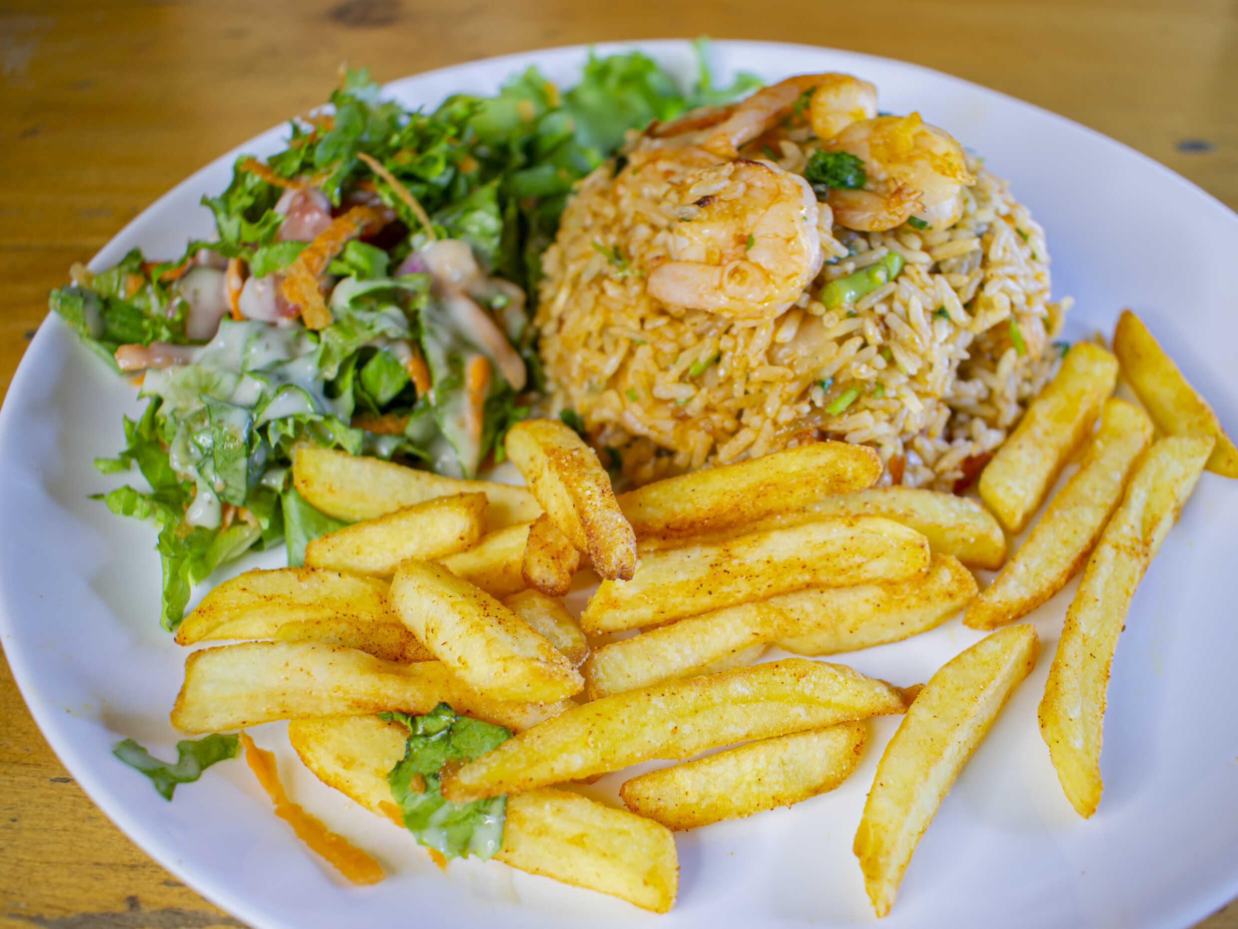 Arroz con camarones, papas fritas y ensalada verde.