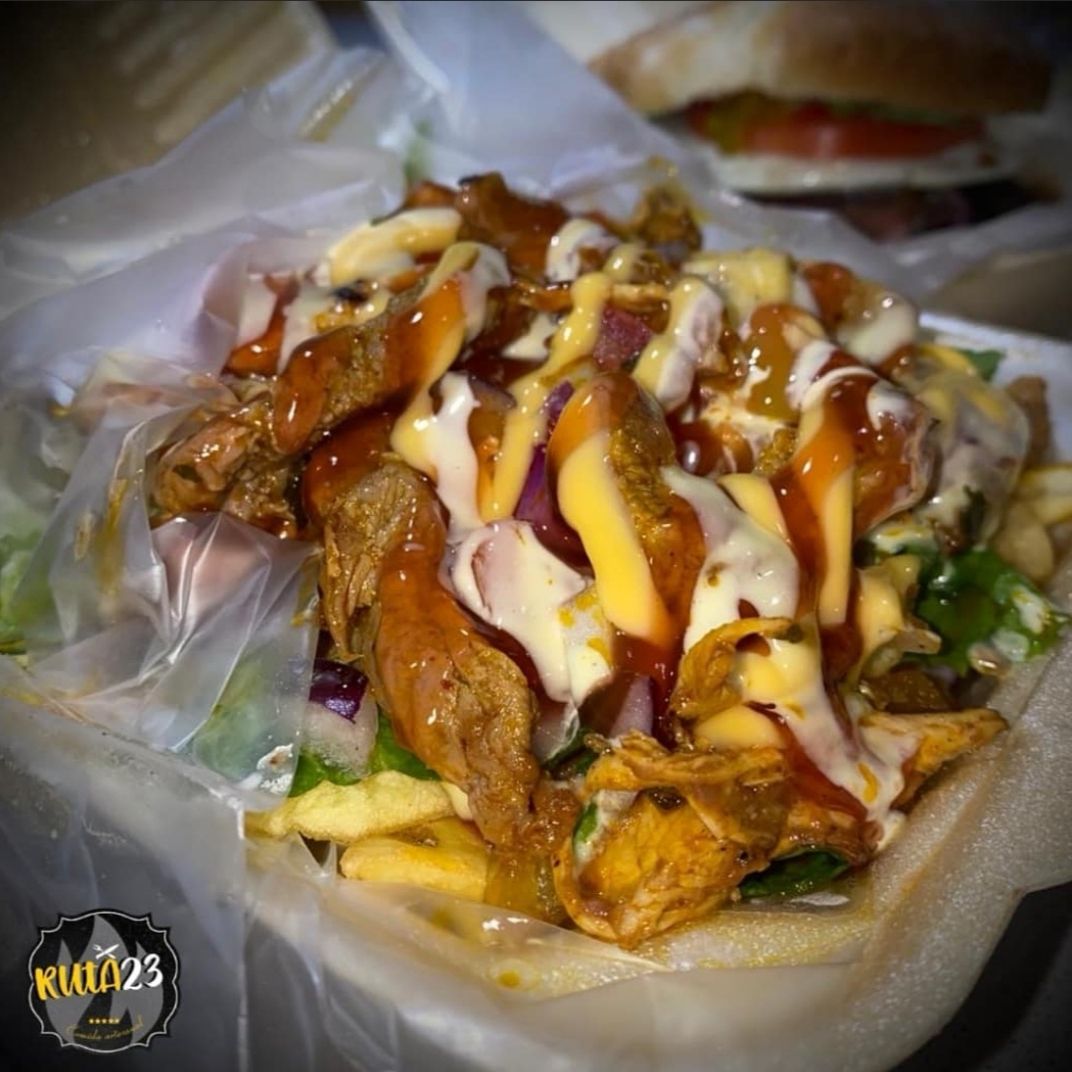 Papas fritas, carne, lechuga, pico de gallo, guacamole, frijoles molidos, salsa de queso y salsas de la casa.