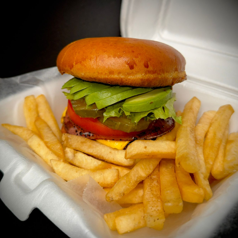 Torta artesanal, queso mozzarella, bacon, huevo frito, tomate, lechuga, cebolla caramelizada, pepinillo y salsa de la casa.