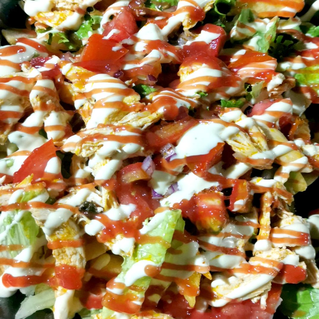 Papas fritas, pollo, lechuga, pico de gallo, guacamole, frijoles molidos, salsa de queso y salsas de la casa.