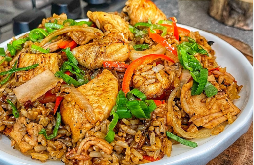 Porción personal: Delicioso arroz con pollo (arroz frito, pollo, cebolla, cebollino, zanahoria rallada, huevo, salsa china), porción a elegir.