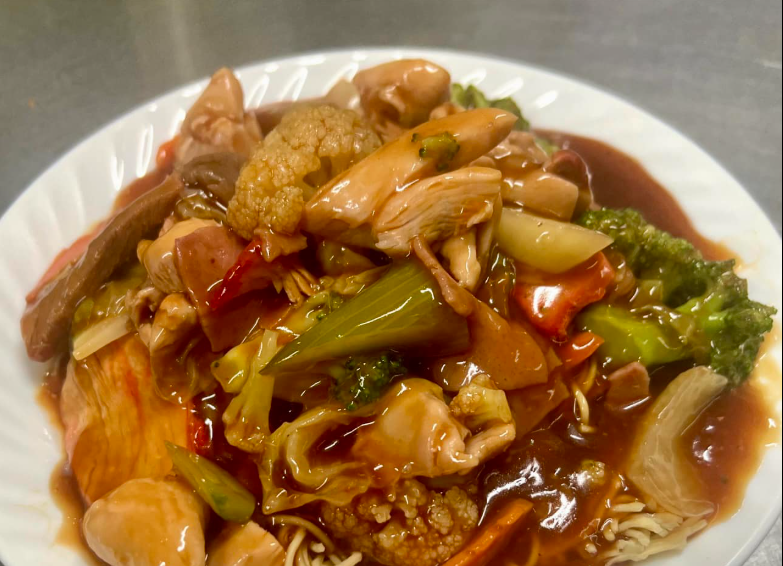 Delicioso arroz especial (arroz frito, jamón, lechón, pollo, chorizo chino y camarones, cebolla, cebollino, zanahoria rallada, huevo, salsa china), porción a elegir.