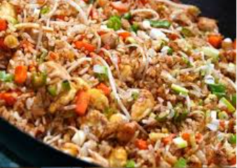 Delicioso arroz cantones (arroz frito, jamón, lechón, pollo, cebolla, cebollino, zanahoria rallada, huevo, salsa china), porción a elegir.