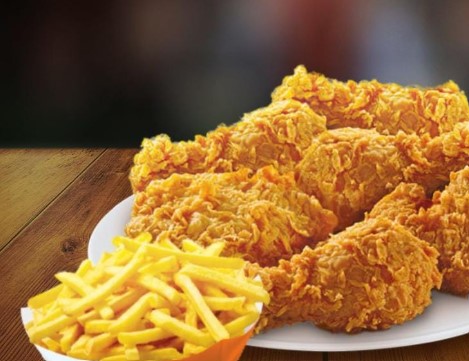 6 Piezas de pollo frito y Papas Fritas.