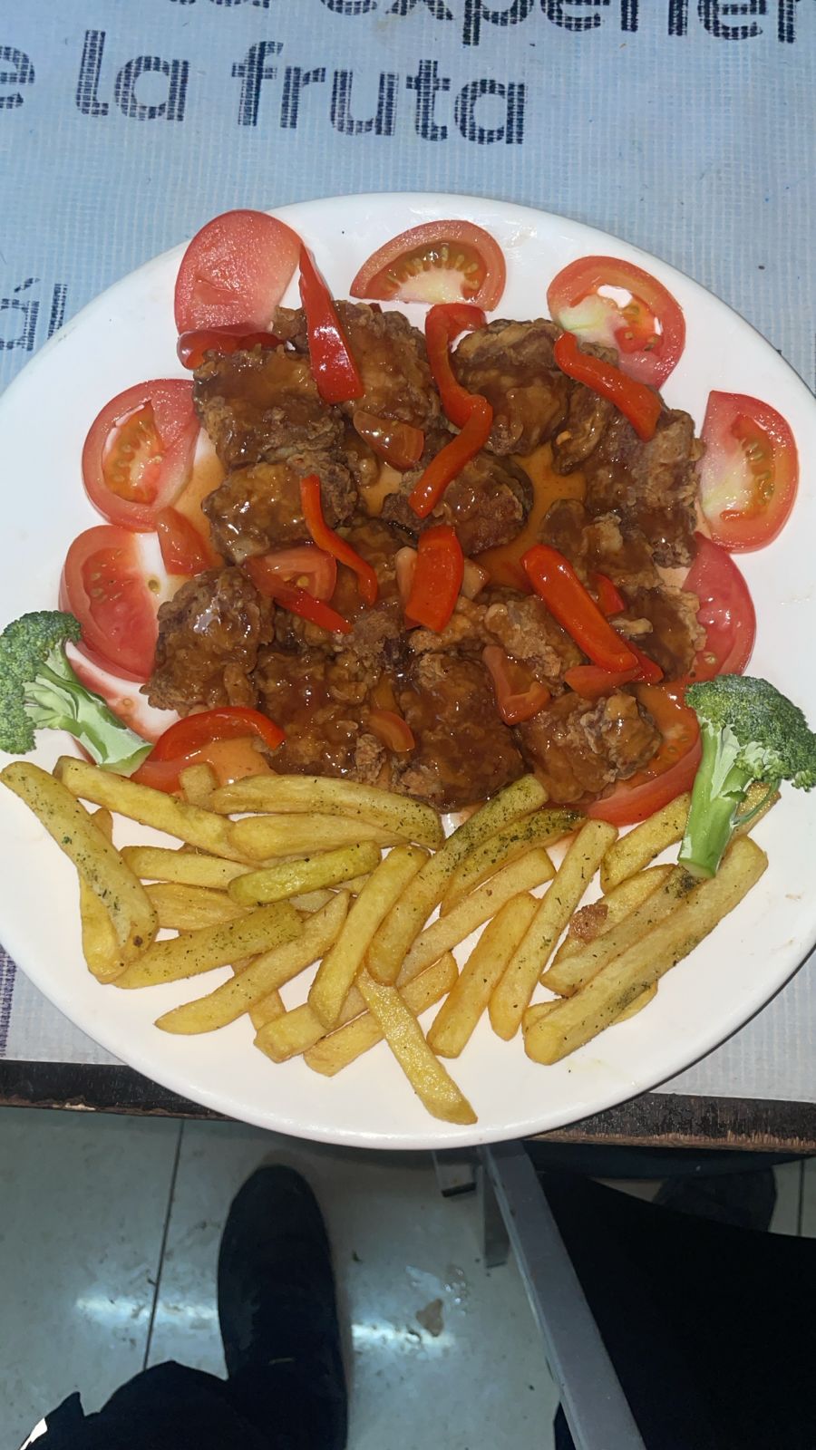 Deliciosas costillas bañadas en salsa agridulce acompañadas de papas fritas