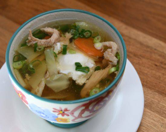 Consomé de pollo verduras (brócoli, zucchini y zanahoria), cebollín y un huevo.
