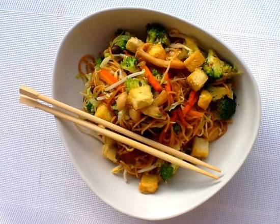 Deliciosa mezcla de vegetales con fideos.