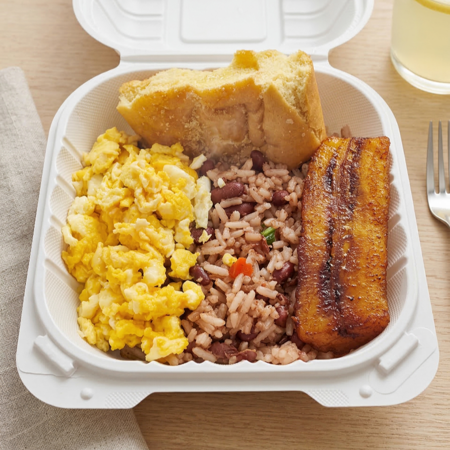 Platillo personal con gallo pinto y huevo al gusto, acompañado de tortilla o pan (a elegir), natilla, salchichón y plátano maduro. Incluye bebida a elección.