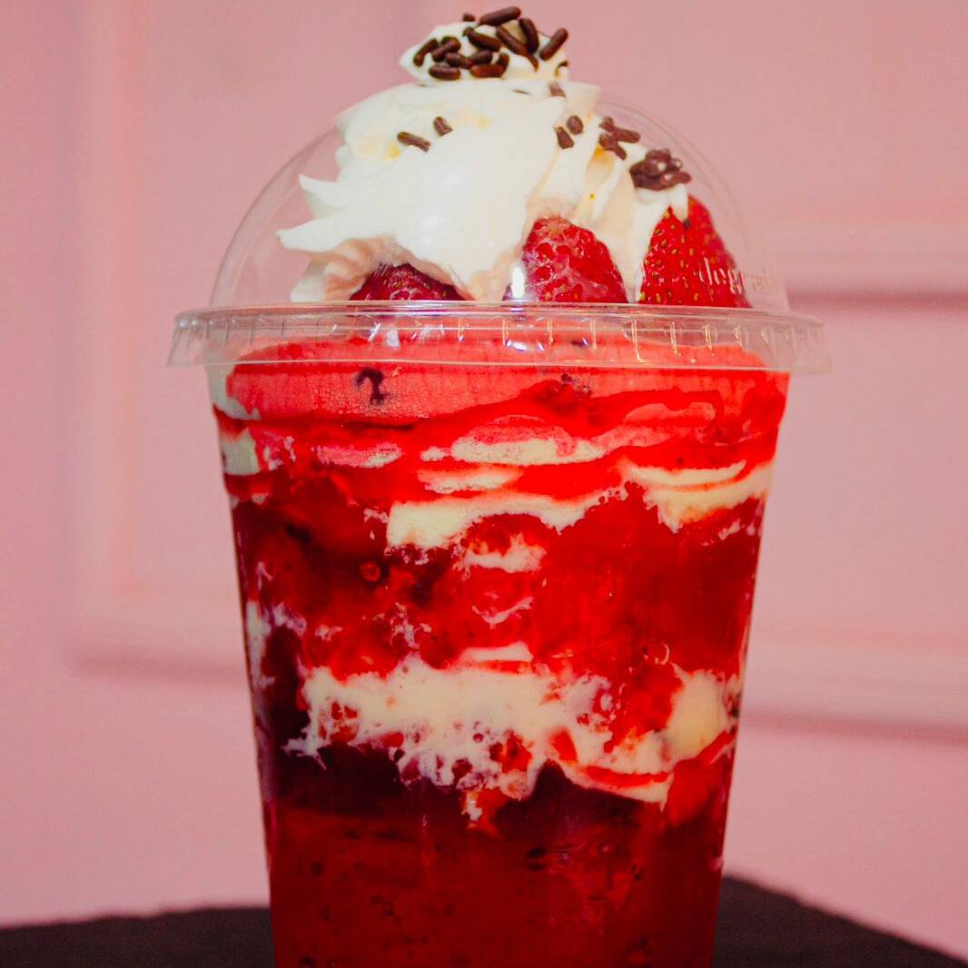 Fresas, gelatina, dos bolas de helado, chantilly, leche en polvo, jarabe de fresa, un topping o glaseado a elección.