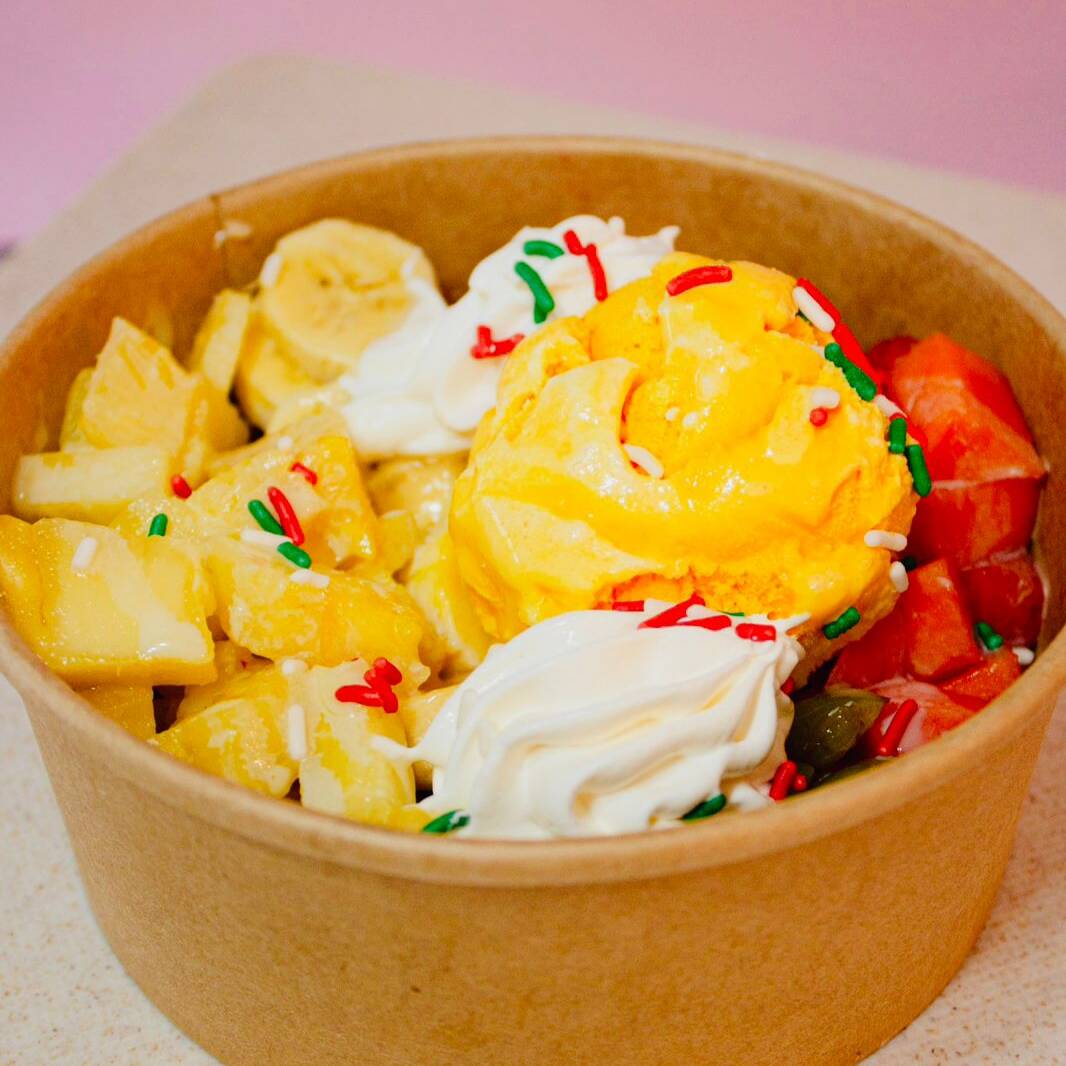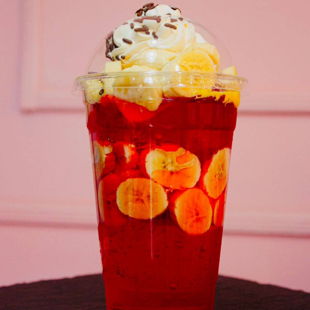 Banano, papaya, piña, uva, fresa, gelatina, una bola de helado, chantilly, leche condensada, chispas de colores, jarabe de fresa.
