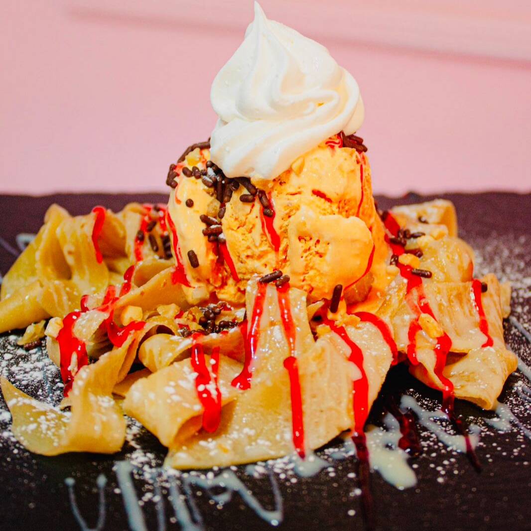 Crepa cortada como espagueti con una fruta, un topping, un glaseado, chantilly y una bola de helado a elección.