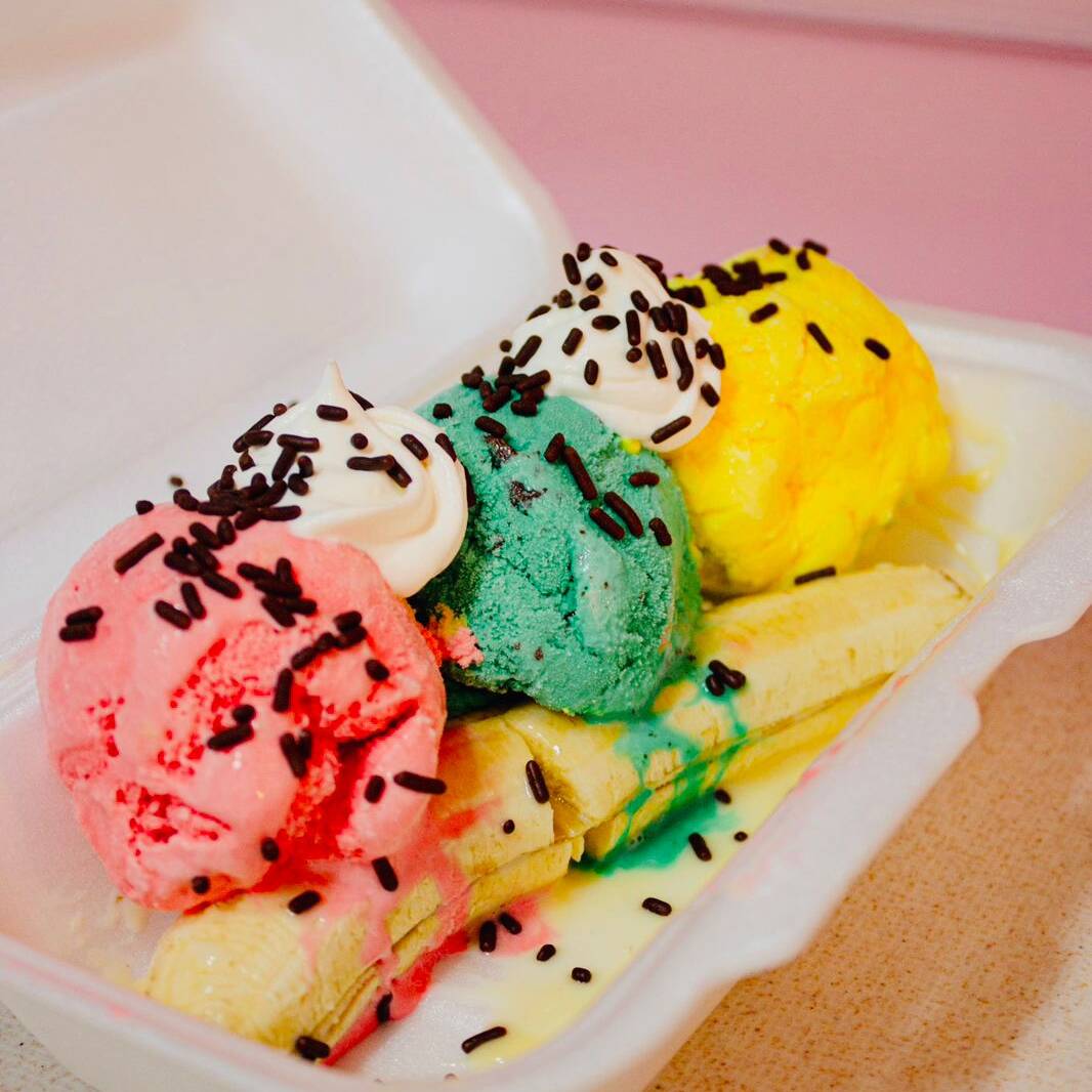 Banano, tres bolas de helado, chantilly, leche condensada, chispas de chocolate.