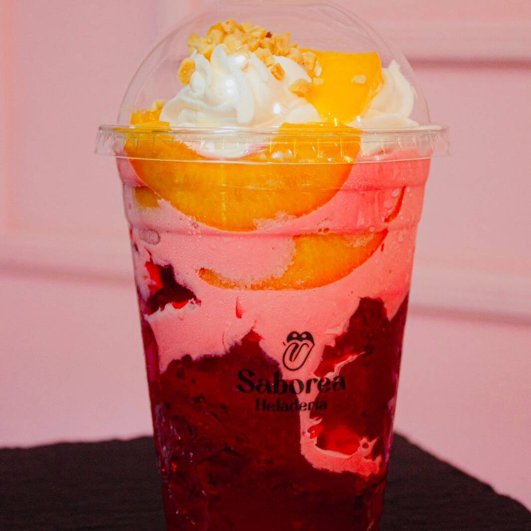 Melocotones, gelatina, dos bolas de helado, chantilly, leche en polvo, glaseado de chocolate, un topping o glaseado a elección.