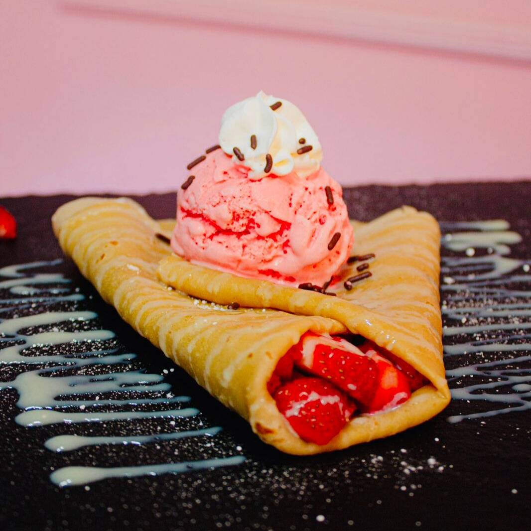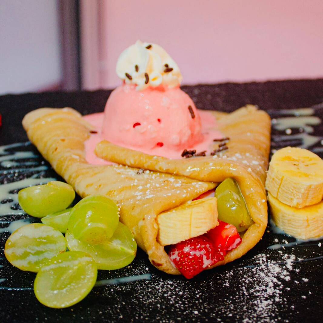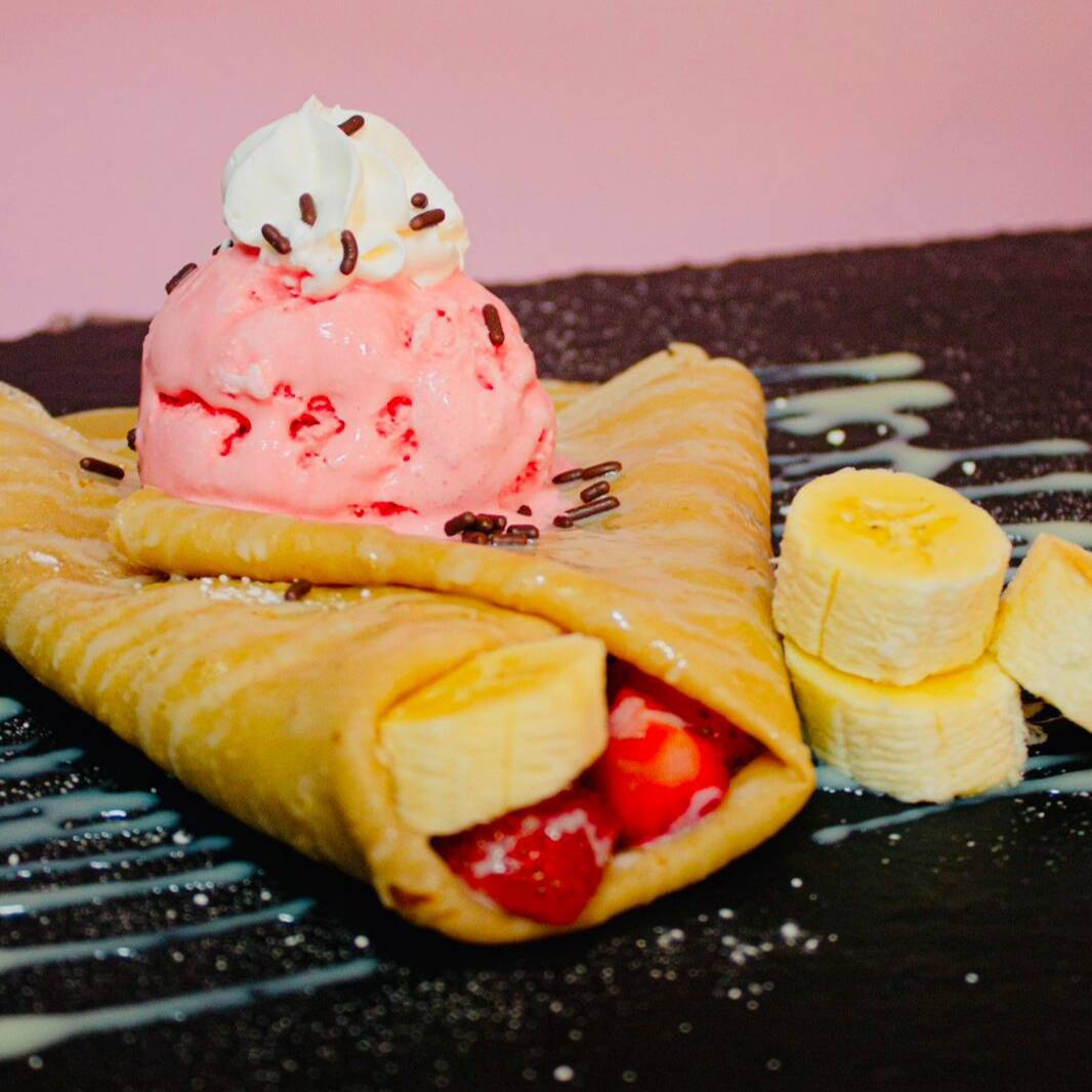 Crepa dulce con dos frutas, un topping, un glaseado, chantilly y una bola de helado a elección.