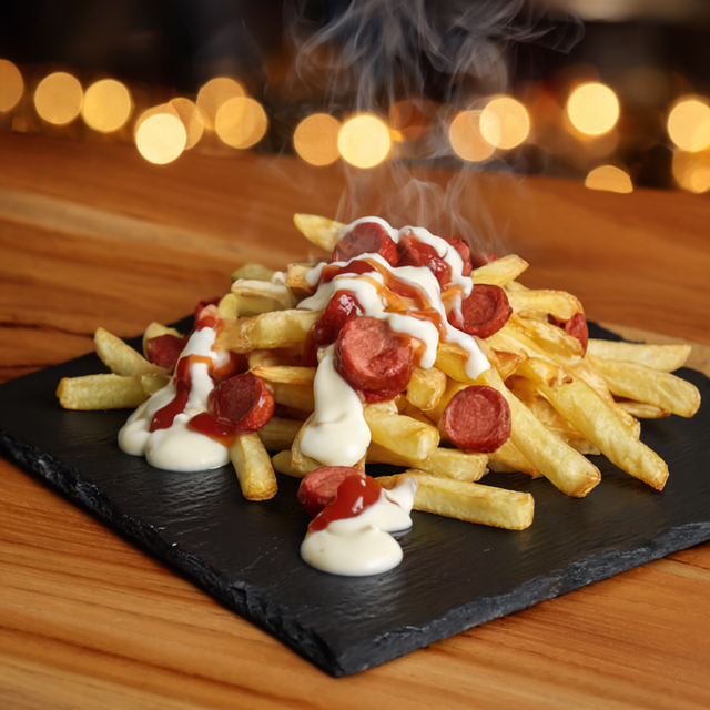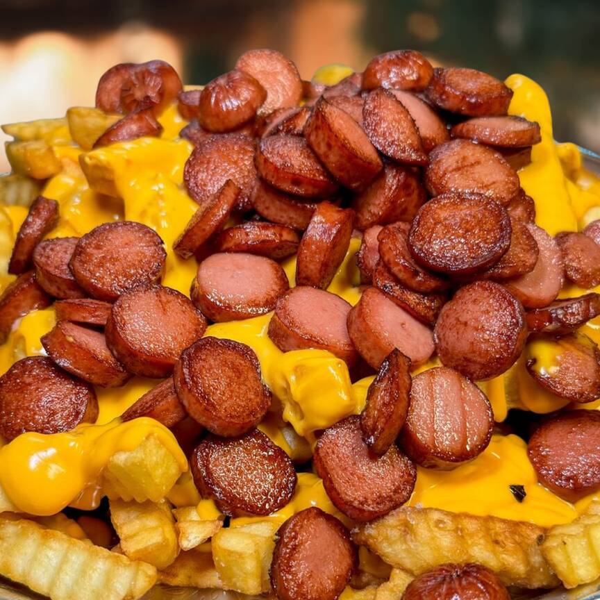 400g de papas gruesas doradas + 100g de salchichas bañadas en queso cheddar derretido y nuestras salsas caseras. Un clásico callejero en su versión XL, cargado de sabor y puro antojo. 🔥🍟
