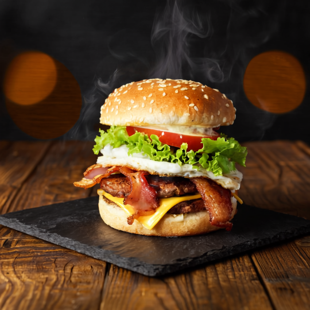 Doble torta de carne, tocineta, huevo, lechuga, tomate, mayonesa casera y salsa de tomate. Potente y sabrosa.