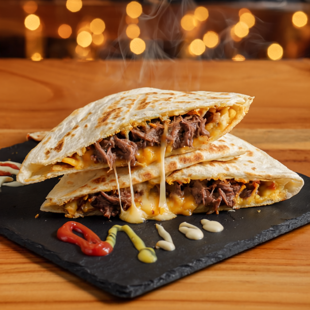 Tortilla de harina, queso derretido, proteina favorita con chile y cebolla. Acompañada con Pico de Gallo y Natilla.