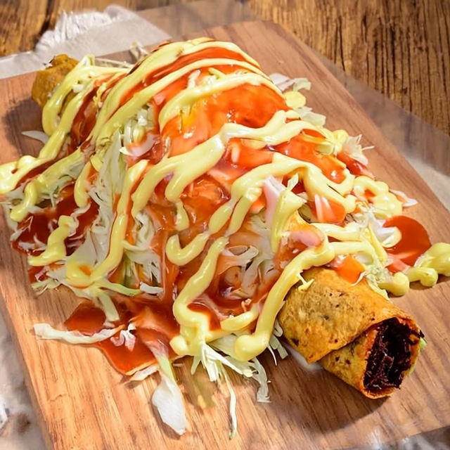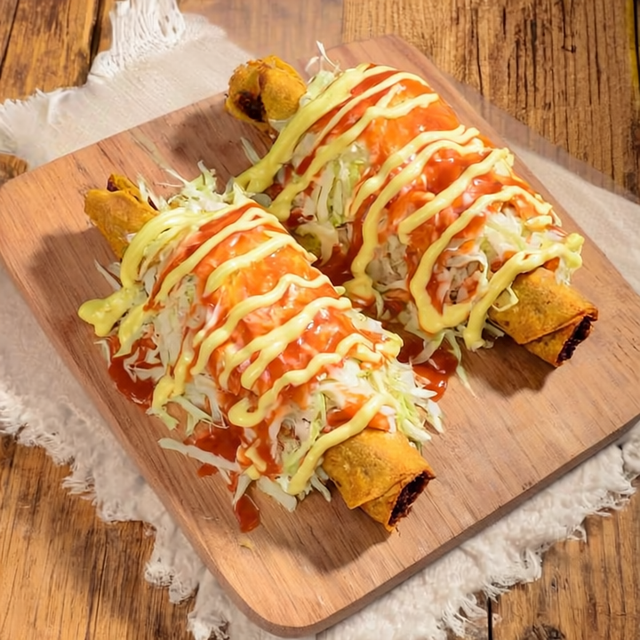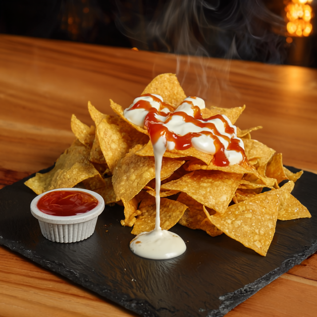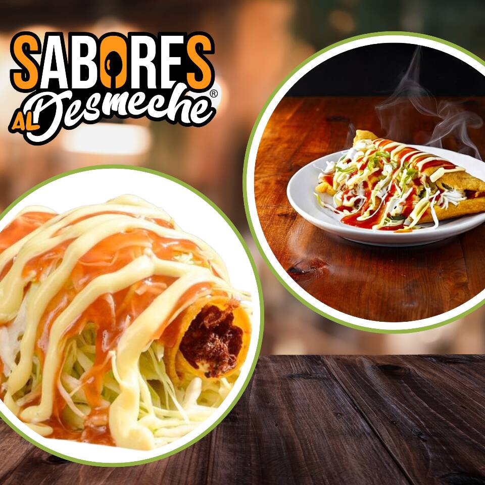 Tortillas de harina fritas, con una base de frijoles molidos y carne mechada (pollo o res). Incluye salsa de tomate, mayonesa, queso Cheddar derretido y para complementar, un fresco pico de gallo servido por aparte.