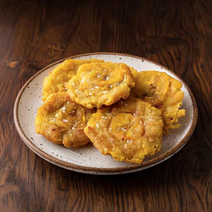Cinco patacones crocantes acompañados de frijoles molidos y pico de gallo fresco. Perfectos como entrada o acompañamiento tradicional.