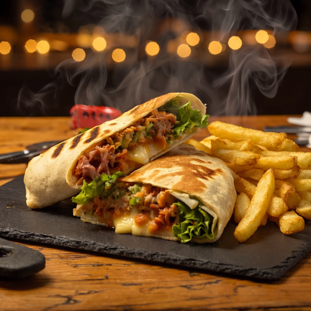 Tortilla de harina, proteína favorita y vegetales. Acompañadas con deliciosas papas fritas.