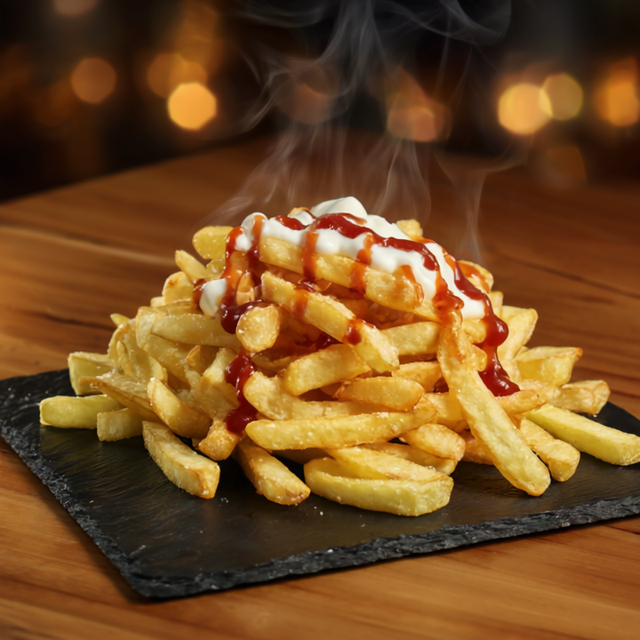 400 Gramos de Papas Fritas con sus salsas favoritas.