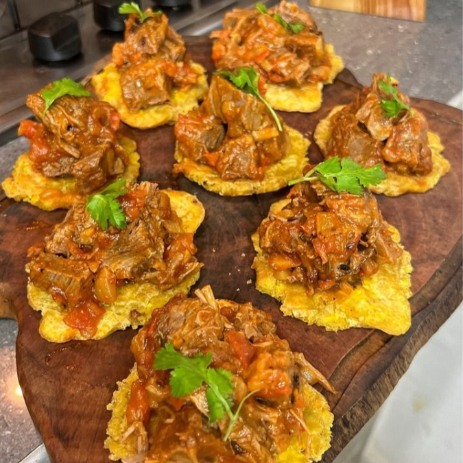 Cinco patacones grandes con frijoles molidos, tu proteína desmechada favorita (carne, pollo o mixto) 🥩🍗, más nuestra mayonesa de la casa, salsa de tomate, queso cheddar fundido 🧀 y pico de gallo fresco al lado. ¡Supremos en sabor, supremos para compartir! 🔥