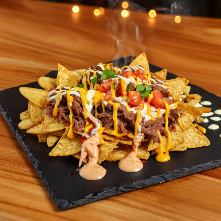 Una mezcla explosiva: papas, nachos y patacones, con proteína desmechada, frijoles, queso cheddar fundido y salsas al gusto. Pico de gallo servido aparte para el toque fresco. ¡Todo en uno, todo brutal!