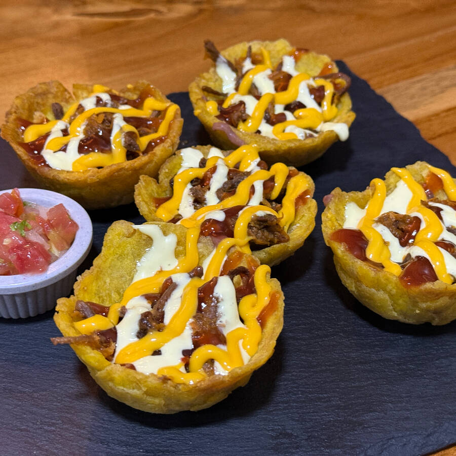 Cinco canastitas de patacón crocante con tu proteína favorita: carne, pollo o mixto. ✨ Cubiertas con mayonesa, salsa de tomate y queso cheddar fundido, con pico de gallo fresco al lado. ¡Un bocado que te va a encantar! 🔥