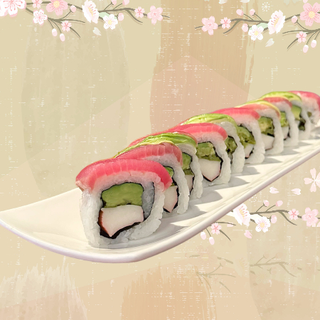 Pepino, aguacate, kanikama, cubierto con lonjas de atún marlín y salmón.