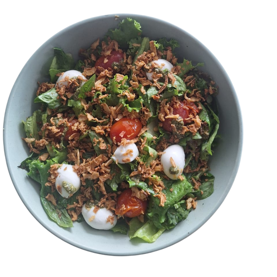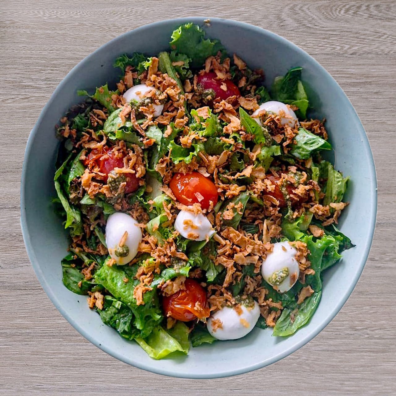 Mezcla de lechugas, albahaca, mozzarella, cebolla crujiente, tomate cherry confitado, aderezo pesto albahaca.